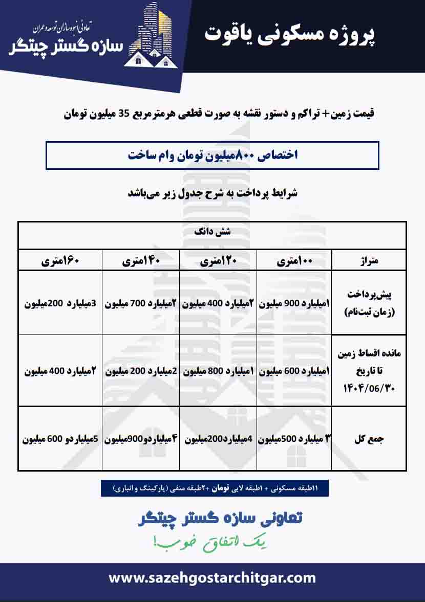 پروژه یاقوت، در شهرک صدرا یکی از بهترین نقاط منطقه ۲۲ واقع شده است. تعاونی سازنده برج یاقوت دارای رزومه ای درخشان در حوضه ساخت و ساز است.