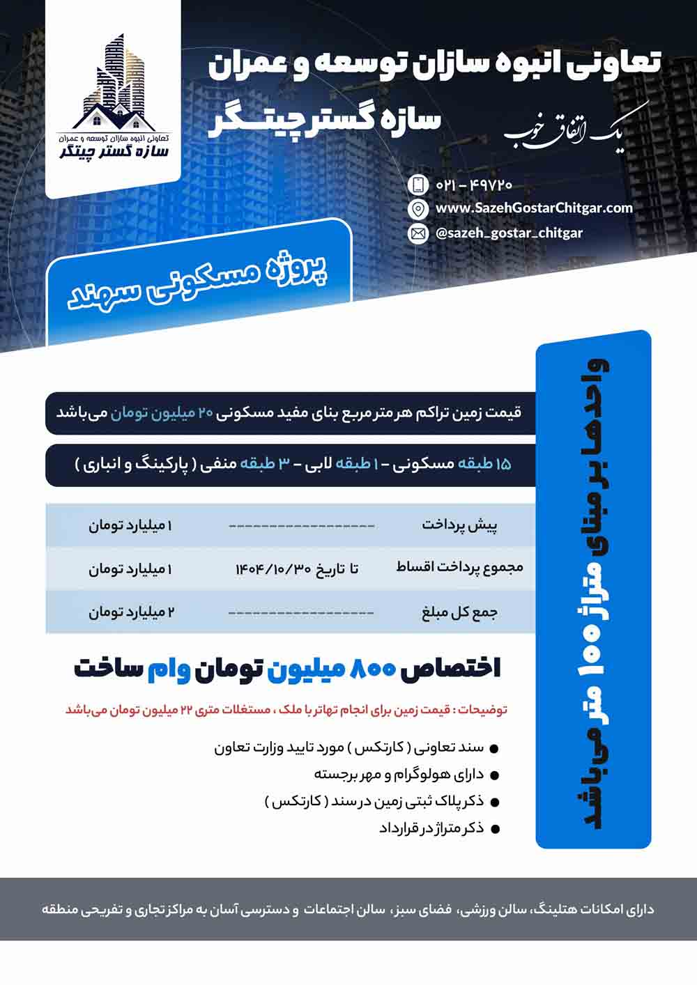 شرکت تعاونی سازه گستر چیتگر، با هدف خانهدار کردن اقشار کم درآمد جامعه و در راستای استراتژی سازمانی خود که همان تعهد و تخصص میباشد، در منطقه ۲۲ تهران، اقدام به انتخاب و خرید زمین با موقعیت ویژه کرده و پس از خرید زمینهای مذکور، متعهد به ساخت با مصالح مرغوب و بر طبق استانداردهای روز صنعت ساختمان شده و در عین حال با برنامهریزیهای دقیق و کارشناسی شده، متعهد به تحویل پروژه در زمان مقرر خواهد بود.